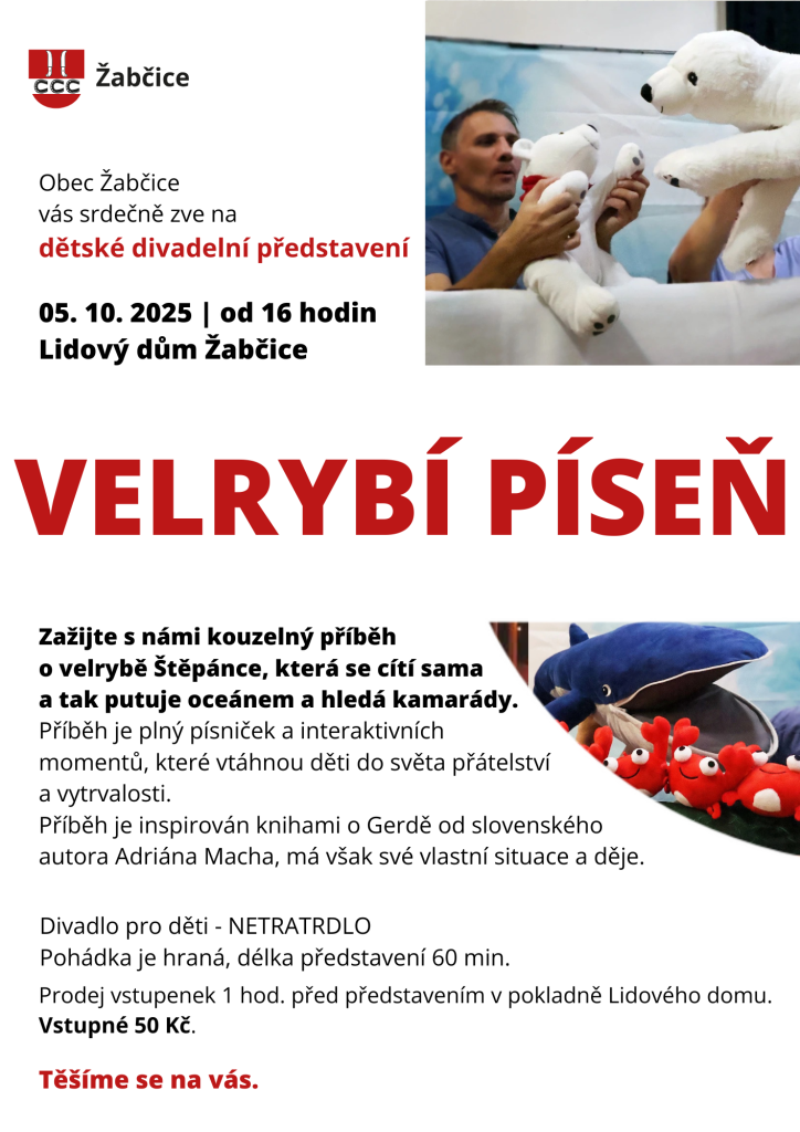 V neděli 5. října od 16 hodin uvede divadlo Netratrdlo v Lidovém domě Žabčice představení Velrybí píseň – příběh plný písniček a kouzelných momentů o velrybě Štěpánce, která hledá kamarády.