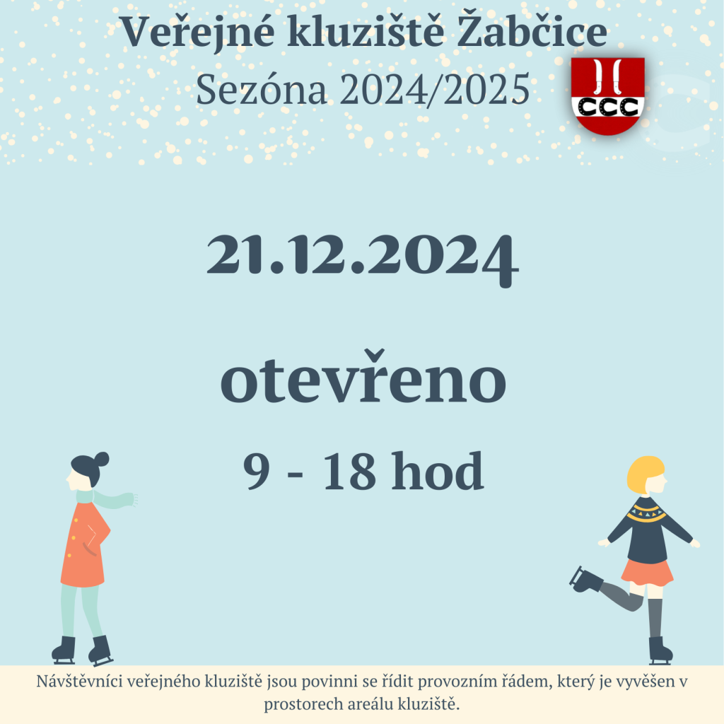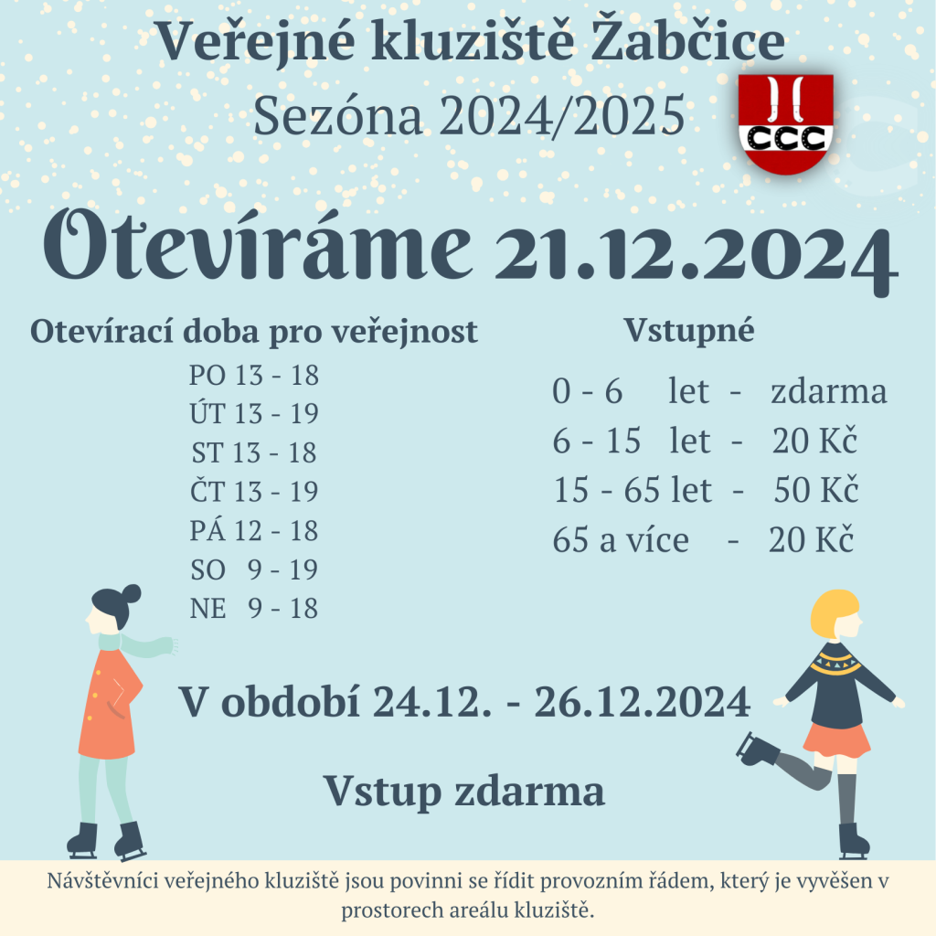 Od zítřejšího dne otevíráme kluziště. Jako každý rok jsme pro vás připravili v období 24. - 26. prosince vstupné zdarma a do 5. ledna 2025 bude otevírací doba kluziště od 9 do 18 hodin. Pro případné změny FB sledujte stránky Kluziště Žabčice - aktuální informace.